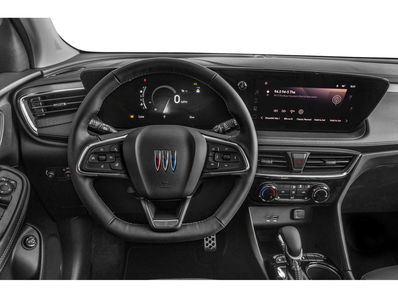2-Way Power Driver Lumbar Control, 4-Way Manual Passenger Seat Adjuster, 4-Wheel Disc Brakes, 5.45 Final Drive Axle Ratio, 6 Speakers, 6-Way Manual Driver Seat Adjuster, 8-Way Power Driver Seat Adjuster, ABS brakes, Air Conditioning, All-Weather Floor Liners, Alloy wheels, AM/FM radio: SiriusXM, Auto High-beam Headlights, Automatic temperature control, Brake assist, Bumpers: body-color, Comfort Package, Compass, Delay-off headlights, Driver door bin, Driver vanity mirror, Dual front impact airbags, Dual front side impact airbags, Electronic Stability Control, Emergency communication system: OnStar and Buick connected services capable, Enhanced Performance 6-Speaker System, Flat-Folding Front Passenger Seatback, Front anti-roll bar, Front Bucket Seats, Front Center Armrest, Front License Plate Bracket, Front reading lights, Front wheel independent suspension, Fully automatic headlights, Heated door mirrors, Heated Driver and Front Passenger Seats, Heated Steering Wheel, Illuminated entry, Knee airbag, Leatherette Seat Trim, Low tire pressure warning, Occupant sensing airbag, Outside temperature display, Overhead airbag, Overhead console, Panic alarm, Passenger door bin, Passenger vanity mirror, Power door mirrors, Power steering, Power windows, Preferred Equipment Group 1SD, Radio data system, Radio: AM/FM Audio System, Rear Center Armrest, Rear reading lights, Rear side impact airbag, Rear window defroster, Rear window wiper, Remote keyless entry, Ride and Handling Suspension, Security system, SiriusXM Trial Subscription, Speed control, Speed-sensing steering, Split folding rear seat, Spoiler, Sport steering wheel, Steering wheel mounted audio controls, Tachometer, Telescoping steering wheel, Tilt steering wheel, Traction control, Trip computer, Variably intermittent wipers, Wheels: 18 Gloss Black Aluminum, Wireless Apple CarPlay/Wireless Android Auto.